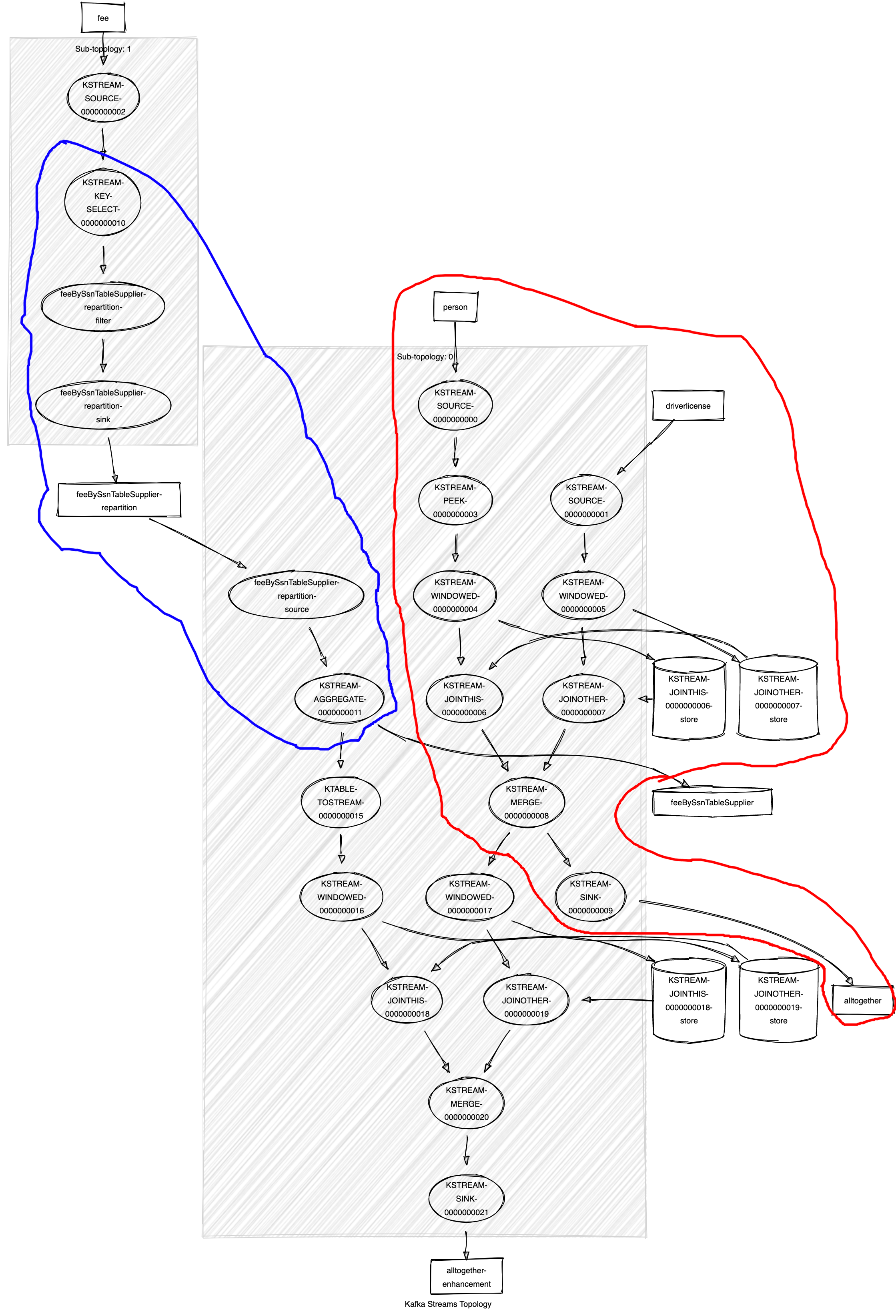 I highlighted with the red line the first topology analyzed in the first section of the article, it’s just represented differently by the graph tool, everything outside the red section was added by the second topology. With the blue section I highlighted the select key/repartition operation needed to respect the co-partition rule. The result of this new join topology is shown below: